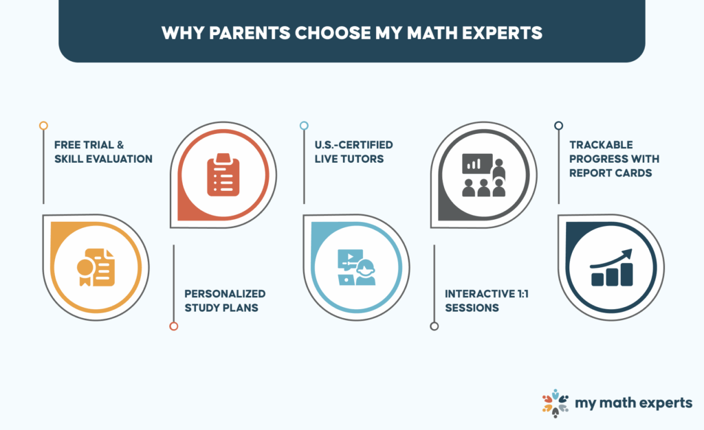 Parents prefer My Math Experts because our tutoring process is based on clarity, consistency, and measurable results. Every student begins their tutoring experience with a free trial class, where we evaluate their current skills and pinpoint the exact topics that are restricting them, such as graphing quadratic equations, simplifying rational expressions, and applying the rules of logarithms. That same trial class gives parents a front-row seat into how our tutoring works, through real-time problem-solving and feedback, while instructing their child from the comfort of their own home with a certified U.S.-based math tutor.
